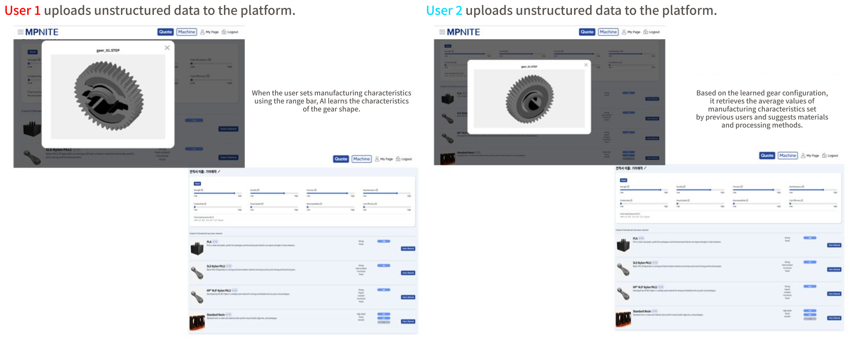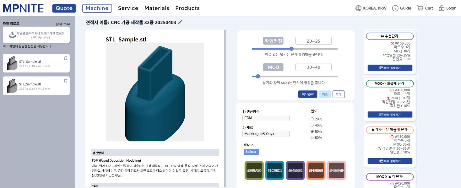 Manufacturing Method and Material Recommendation (Smart Layer™): When you set the desired product characteristics such as strength, precision, heat resistance, and cost efficiency, MPNITE's proprietary Smart Layer™ technology analyzes these requirements and automatically recommends the optimal manufacturing method and material (CMF) combination, reflecting them in the quote.